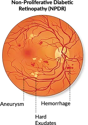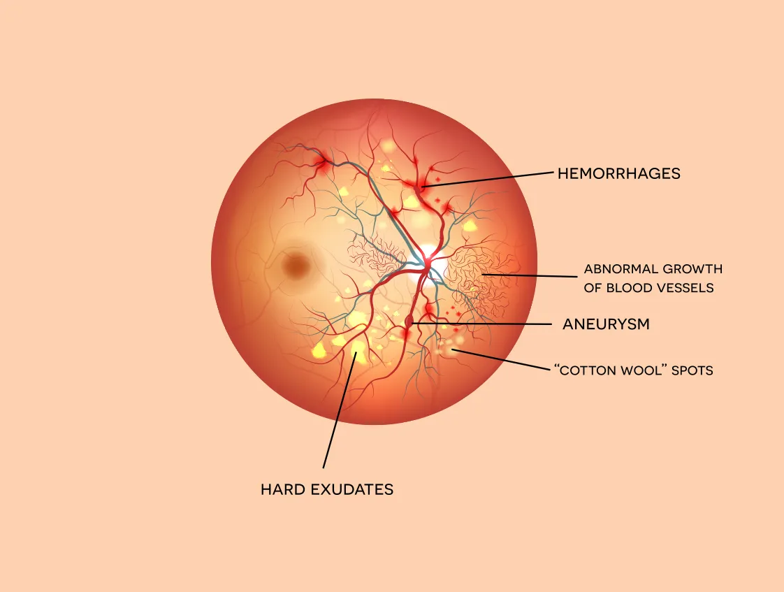 Diabetic Macular Edema (DME) can happen at any stage of DR when fluid leaks into the macula, the part of the retina responsible for sharp central vision.
